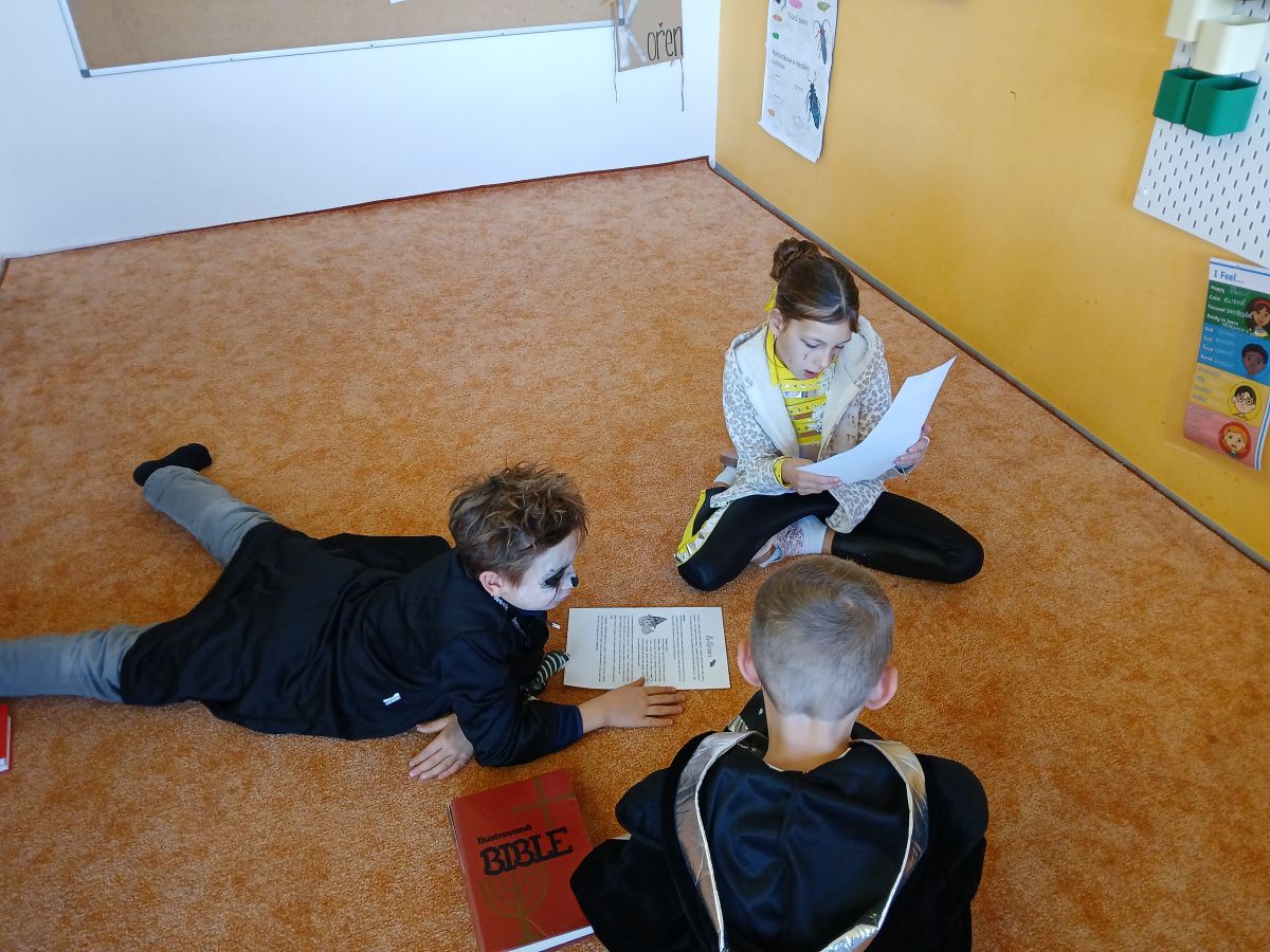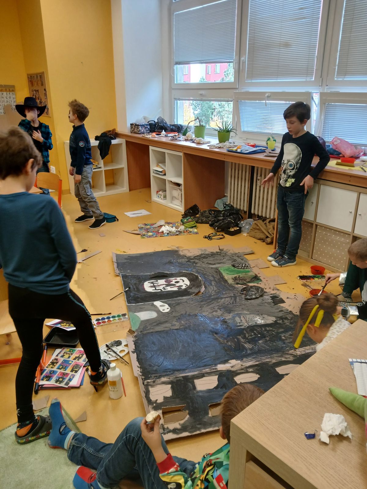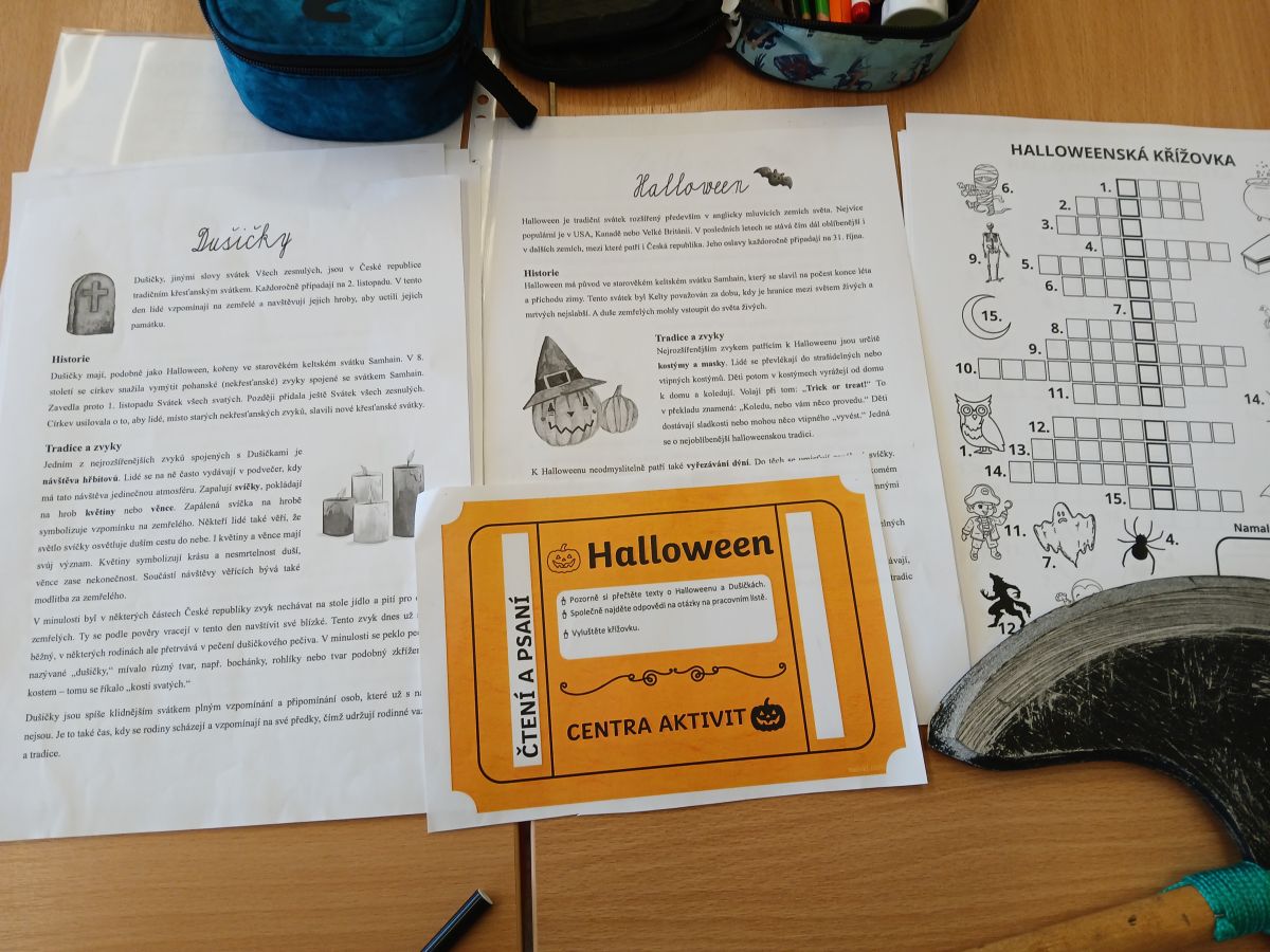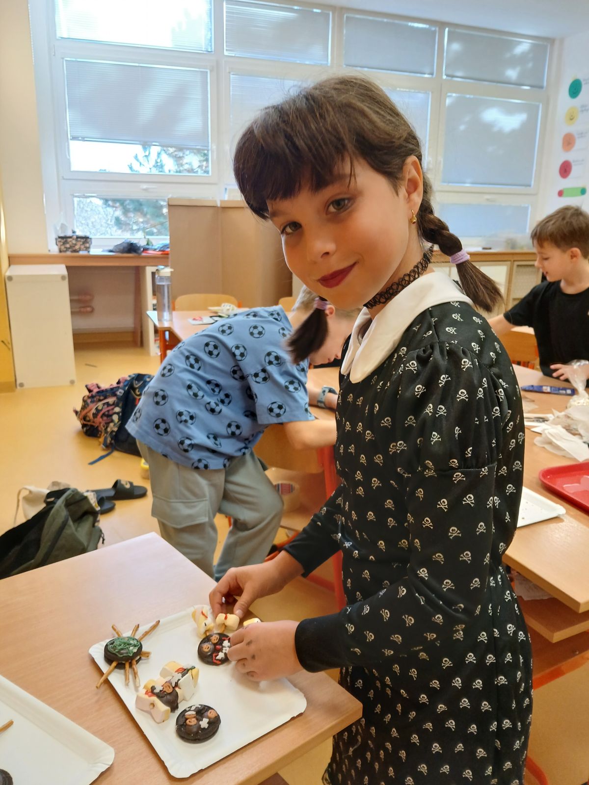 Ale ne, to jen u třeťáků probíhala centra aktivit na téma Dušičky a Halloween 🎃. Děti pracovaly ve skupinách, v CENTRU ČTENÍ A PSANÍ plnily úkoly hlavně na čtení s porozuměním a práci s informacemi. V MATEMATICE luštily tajenku při běhacím počítání, řešily sudoku a pavučiny. Vydaly se také na STRAŠIDELNOU STEZKU/ únikovku plnou šifer. Svoji kreativitu mohly uplatnit na dvou stanovištích – ve VÝTVARNÉM ATELIÉRU, kde vytvořily společný strašidelný hrad a FOOD ATELIÉRU, ve kterém připravily strašidelné dobroty na závěrečnou společnou hostinu. Den si opravdu užily – panovala příjemná a tvořivá atmosféra. A svoje kouzlo tomu dodaly i skvělé kostýmy.