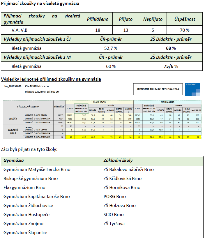 Výsledky přijímacího řízení na víceletá gymnázia najdete ve Výroční zprávě za rok 2023/2024 (str. 12).