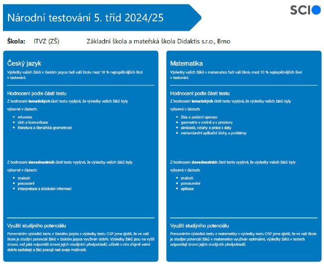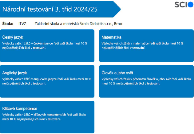 Výsledky vašich žáků v českém jazyce řadí naši školu mezi 10 % nejúspěšnějších škol v testování.