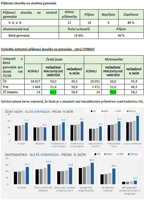 Výsledky přijímacího řízení na víceletá gymnázia najdete také ve Výroční zprávě za rok 2024/2025 (str. 12).